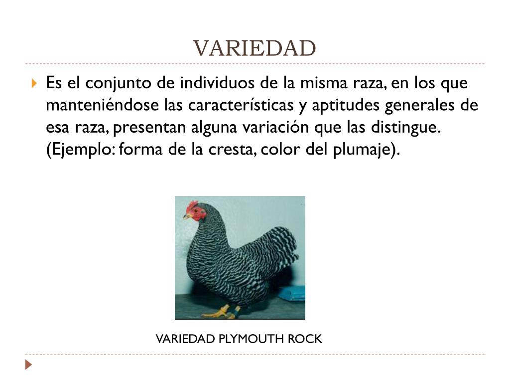 VARIEDAD • Es el conjunto de individuos de la misma raza, en los que manteniéndose las características y aptitudes generales de esa raza, presentan alguna variación que las distingue. (Ejemplo: forma de la cresta, color del plumaje). VARIEDAD PLYMOUTH ROCK