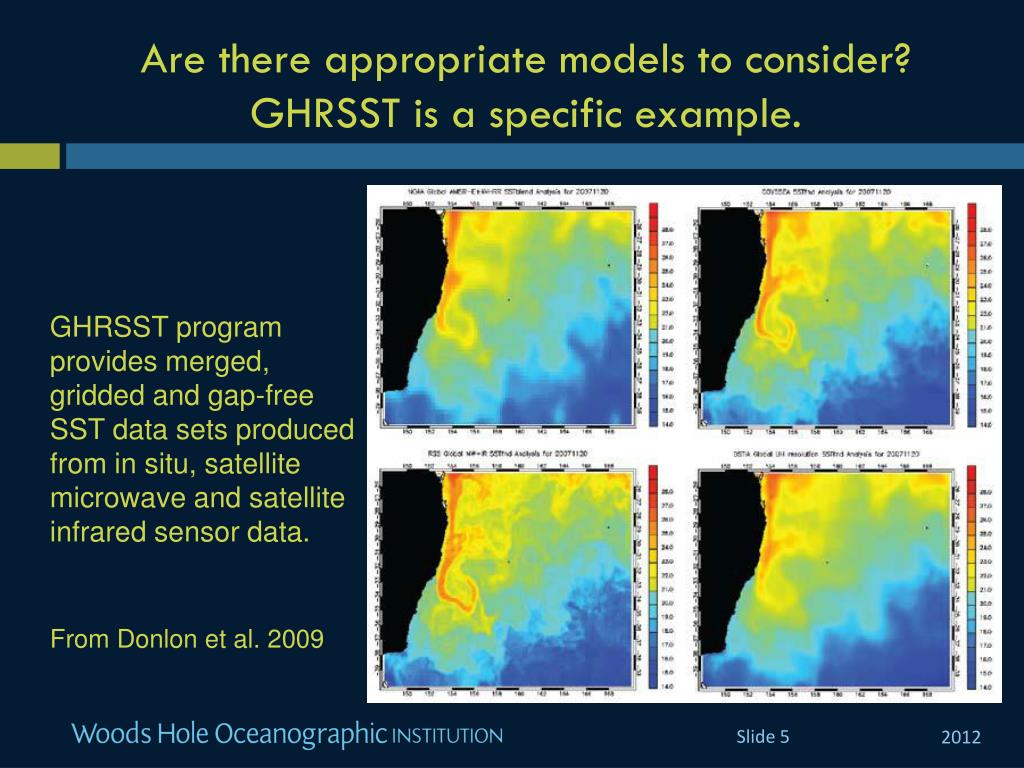 Are there appropriate models to consider?GHRSST is a specific example. GHRSST program provides merged, gridded and gap-free SST data sets produced from in situ, satellite microwave and satellite infrared sensor data. From Donlon et al. 2009