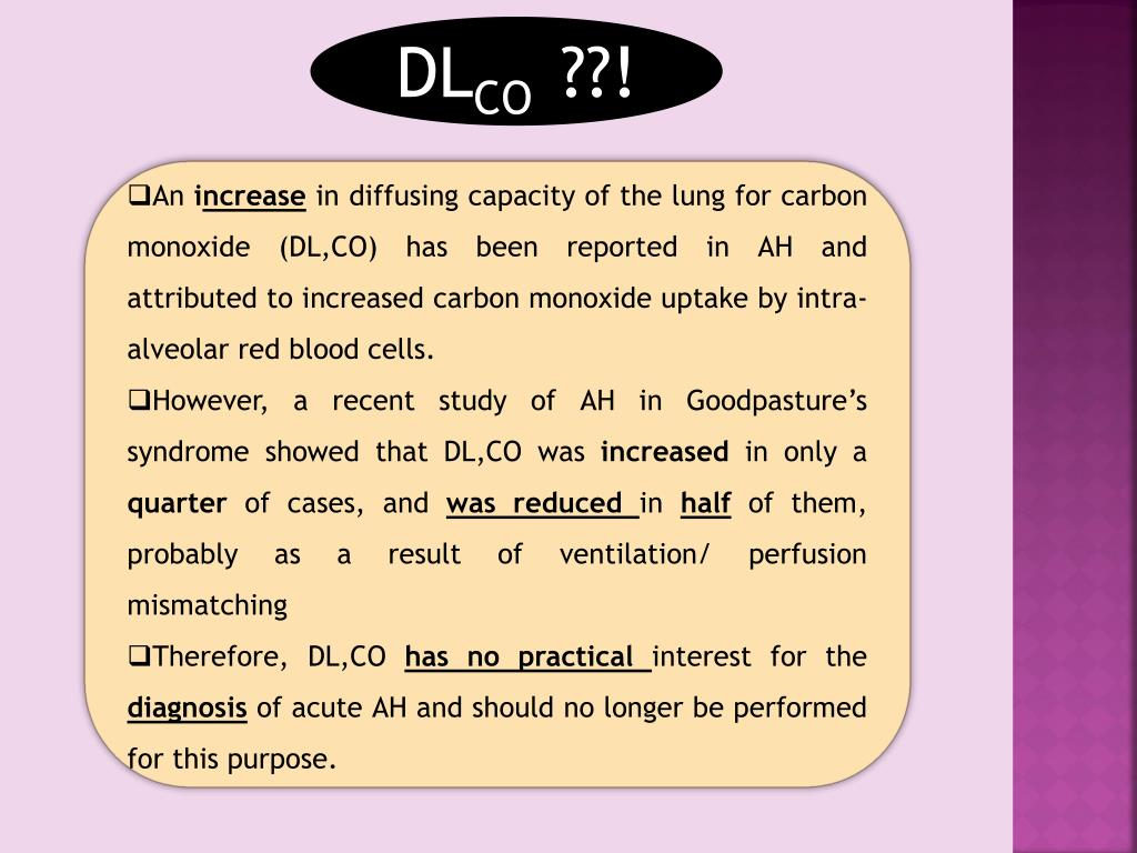 DLCO ??! • An increase in diffusing capacity of the lung for carbon monoxide (DL,CO) has been reported in AH and attributed to increased carbon monoxide uptake by intra-alveolar red blood cells. • However, a recent study of AH in Goodpasture’s syndrome showed that DL,CO was increased in only a quarter of cases, and was reduced in half of them, probably as a result of ventilation/ perfusion mismatching • Therefore, DL,CO has no practical interest for the diagnosis of acute AH and should no longer be performed for this purpose.