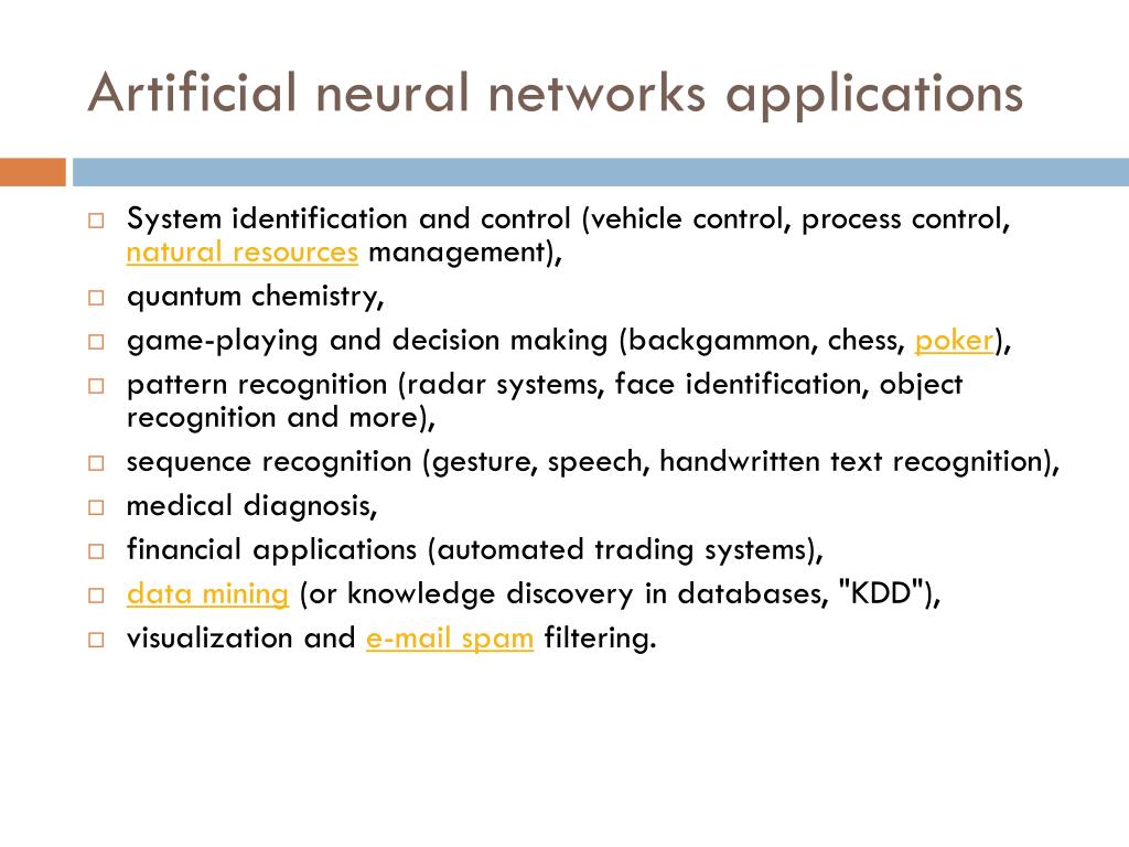 Artificialneuralnetworksapplications • Systemidentification and control (vehiclecontrol, processcontrol, naturalresourcesmanagement), • quantumchemistry, • game-playing and decisionmaking (backgammon, chess, poker), • patternrecognition (radar systems, faceidentification, objectrecognition and more), • sequencerecognition (gesture, speech, handwrittentextrecognition), • medicaldiagnosis, • financialapplications (automated tradingsystems), • datamining (orknowledgediscoveryindatabases, "KDD"), • visualization and e-mail spamfiltering.