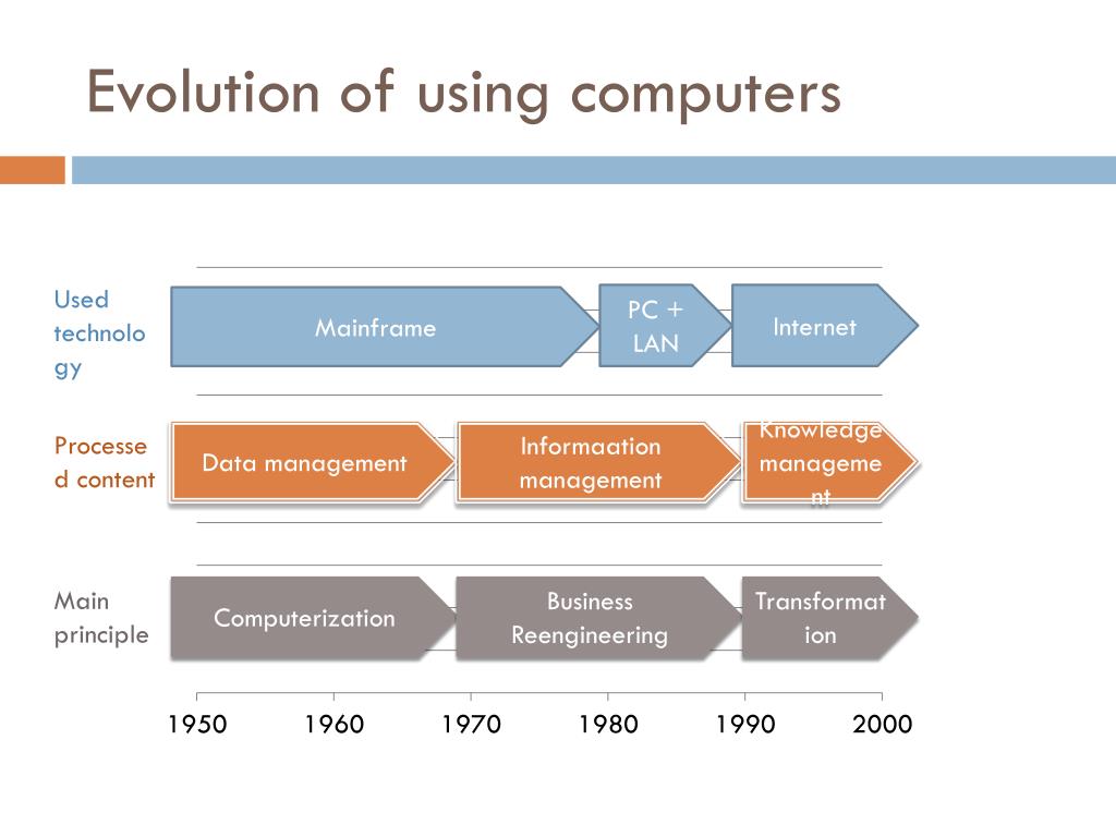 Evolutionofusingcomputers Usedtechnology PC + LAN Internet Mainframe Datamanagement Informaationmanagement Knowledgemanagement Processedcontent Computerization BusinessReengineering Main principle Transformation