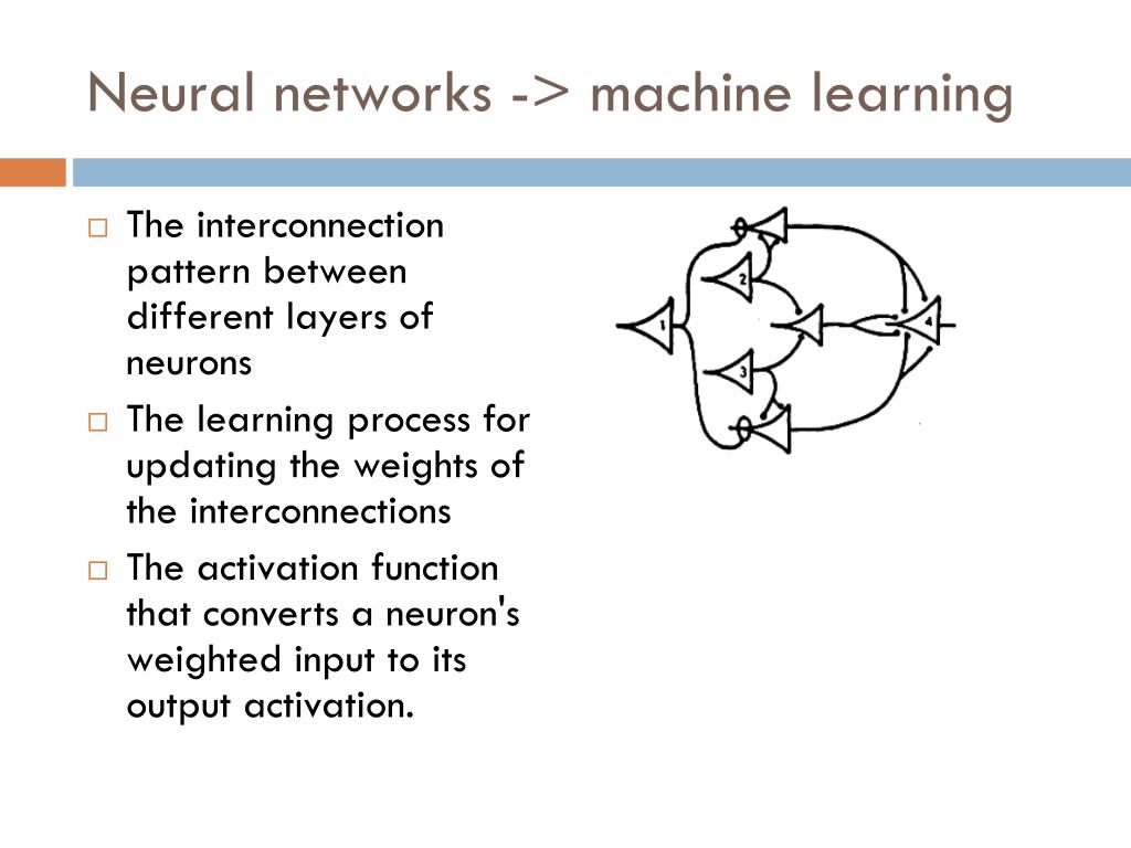Neuralnetworks -> machinelearning • The interconnection pattern between different layers of neurons • The learning process for updating the weights of the interconnections • The activation function that converts a neuron's weighted input to its output activation.