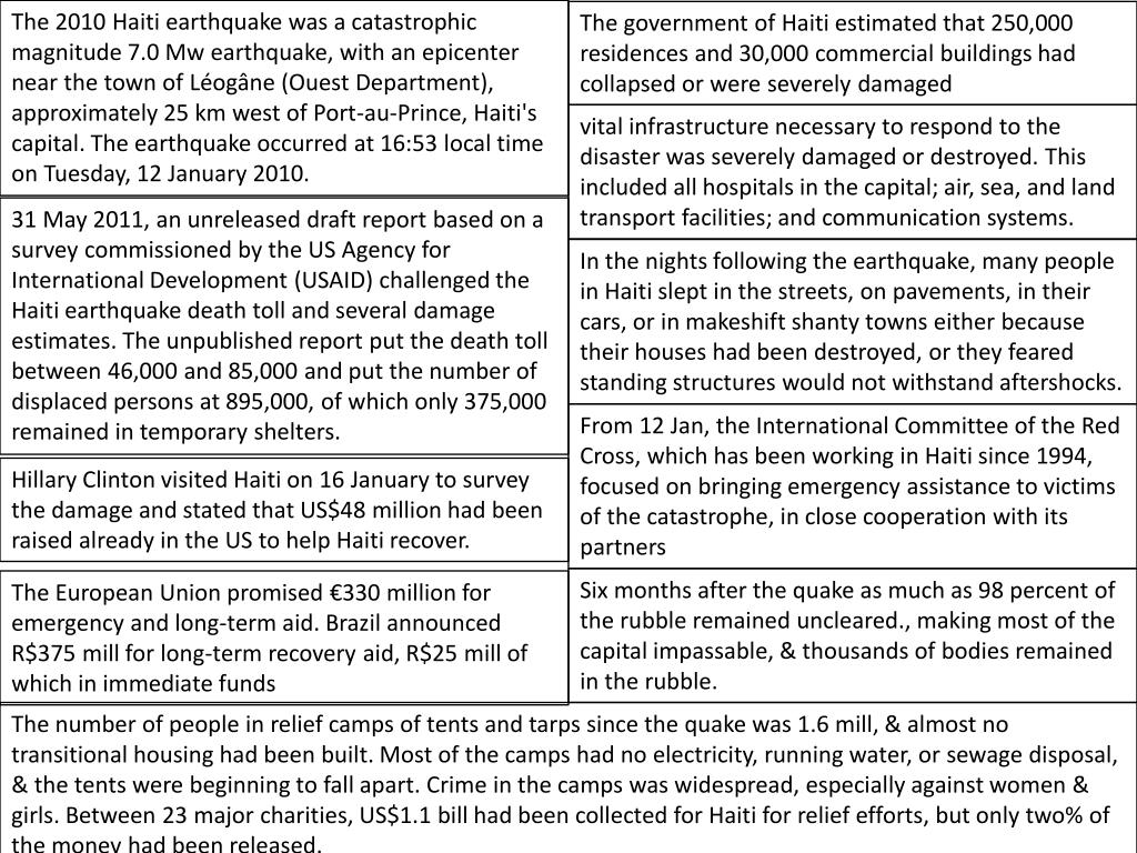 The 2010 Haiti earthquake was a catastrophic magnitude 7.0 Mw earthquake, with an epicenter near the town of Léogâne (Ouest Department), approximately 25 km west of Port-au-Prince, Haiti's capital. The earthquake occurred at 16:53 local time on Tuesday, 12 January 2010. The government of Haiti estimated that 250,000 residences and 30,000 commercial buildings had collapsed or were severely damaged vital infrastructure necessary to respond to the disaster was severely damaged or destroyed. This included all hospitals in the capital; air, sea, and land transport facilities; and communication systems. 31 May 2011, an unreleased draft report based on a survey commissioned by the US Agency for International Development (USAID) challenged the Haiti earthquake death toll and several damage estimates. The unpublished report put the death toll between 46,000 and 85,000 and put the number of displaced persons at 895,000, of which only 375,000 remained in temporary shelters. In the nights following the earthquake, many people in Haiti slept in the streets, on pavements, in their cars, or in makeshift shanty towns either because their houses had been destroyed, or they feared standing structures would not withstand aftershocks. From 12 Jan, the International Committee of the Red Cross, which has been working in Haiti since 1994, focused on bringing emergency assistance to victims of the catastrophe, in close cooperation with its partners Hillary Clinton visited Haiti on 16 January to survey the damage and stated that US$48 million had been raised already in the US to help Haiti recover. Six months after the quake as much as 98 percent of the rubble remained uncleared., making most of the capital impassable, & thousands of bodies remained in the rubble. The European Union promised €330 million for emergency and long-term aid. Brazil announced R$375 mill for long-term recovery aid, R$25 mill of which in immediate funds The number of people in relief camps of tents and tarps since the quake was 1.6 mill, & almost no transitional housing had been built. Most of the camps had no electricity, running water, or sewage disposal, & the tents were beginning to fall apart. Crime in the camps was widespread, especially against women & girls. Between 23 major charities, US$1.1 bill had been collected for Haiti for relief efforts, but only two% of the money had been released.