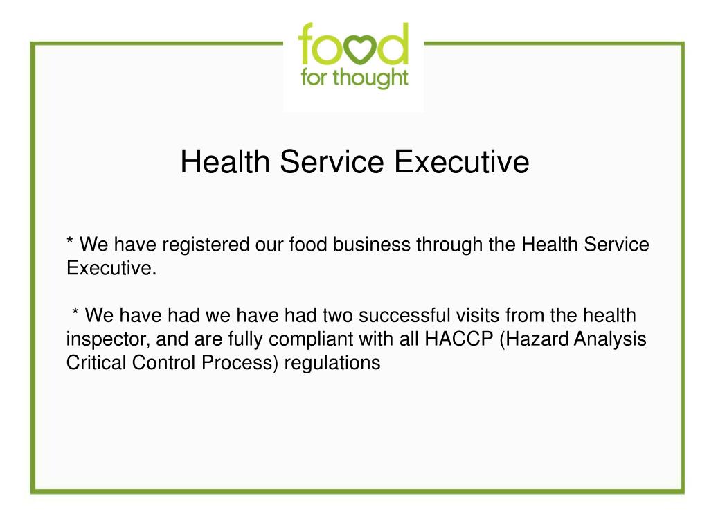 Health Service Executive* We have registered our food business through the Health Service Executive. * We have had we have had two successful visits from the health inspector, and are fully compliant with all HACCP (Hazard Analysis Critical Control Process) regulations