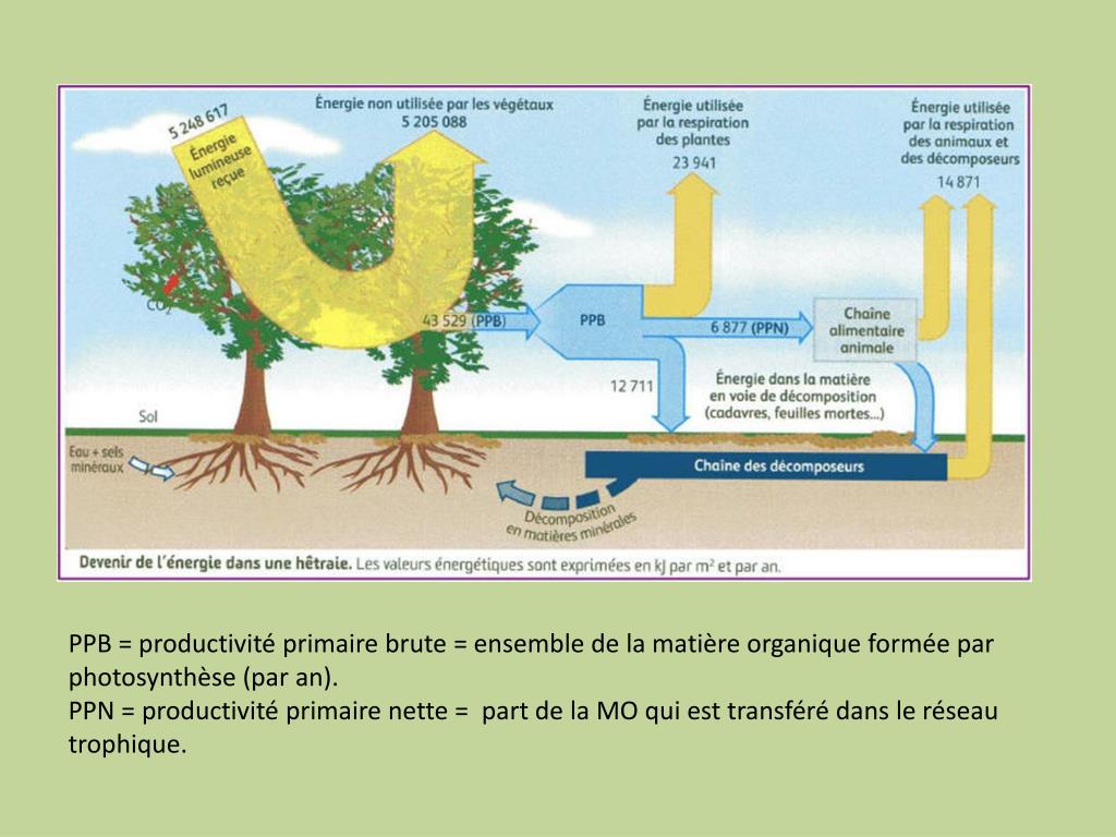 PPB = productivité primaire brute = ensemble de la matière organique formée par photosynthèse (par an). PPN = productivité primaire nette = part de la MO qui est transféré dans le réseau trophique.