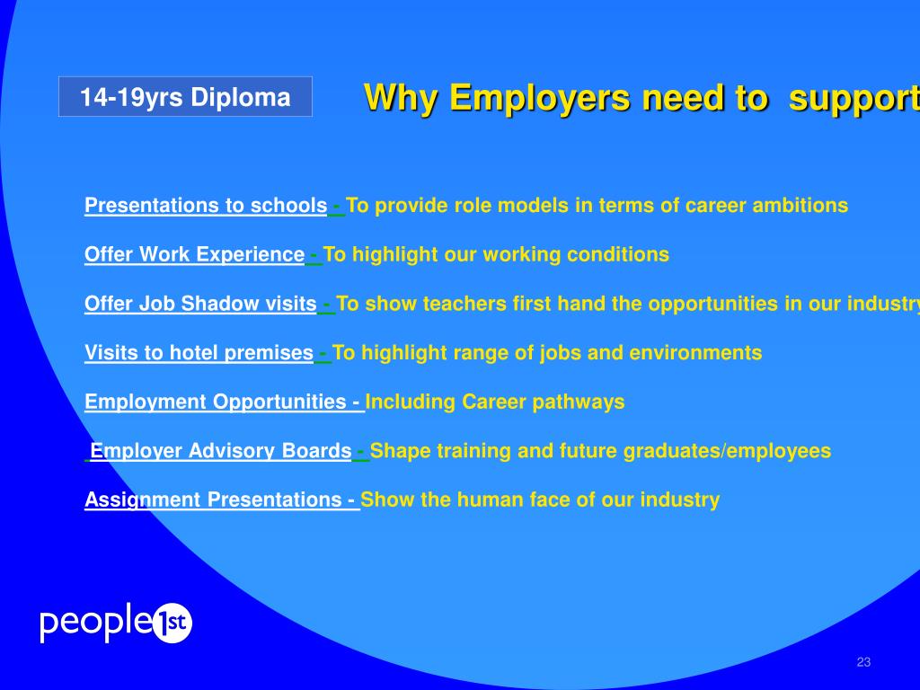 Presentations to schools - To provide role models in terms of career ambitionsOffer Work Experience - To highlight our working conditionsOffer Job Shadow visits - To show teachers first hand the opportunities in our industryVisits to hotel premises - To highlight range of jobs and environmentsEmployment Opportunities - Including Career pathways Employer Advisory Boards - Shape training and future graduates/employeesAssignment Presentations - Show the human face of our industry Why Employers need to support it? 14-19yrs Diploma