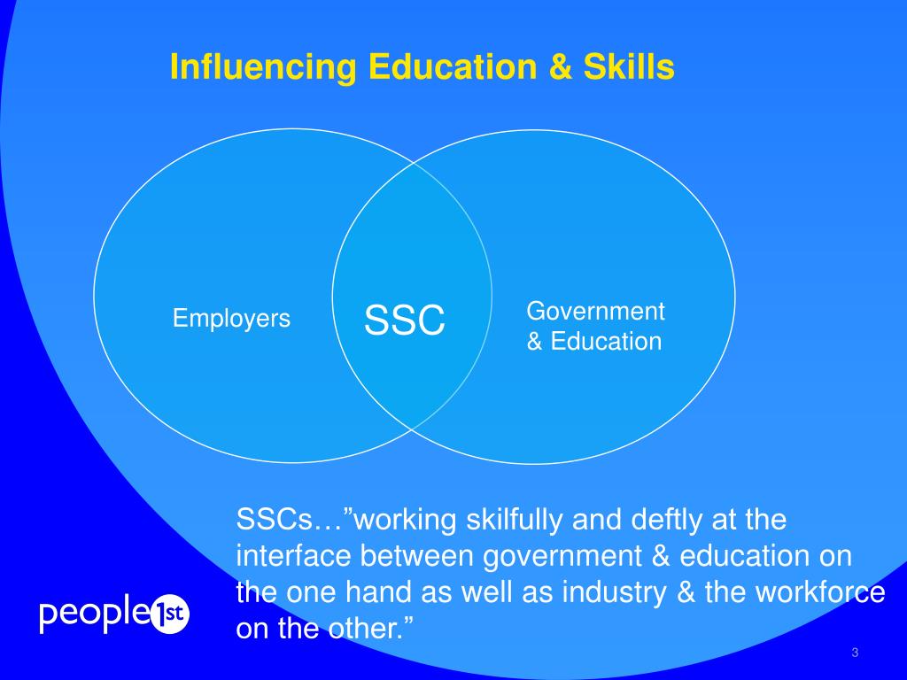 Influencing Education & Skills SSC Government & Education Employers SSCs…”working skilfully and deftly at the interface between government & education on the one hand as well as industry & the workforce on the other.”
