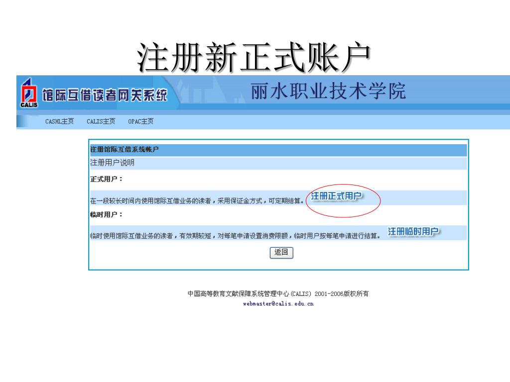 注册新账户流程 选择所属馆 注册新用户 注册正式用户 下一步 填写读者信息 提交 注册成功 等待馆际互借员确认