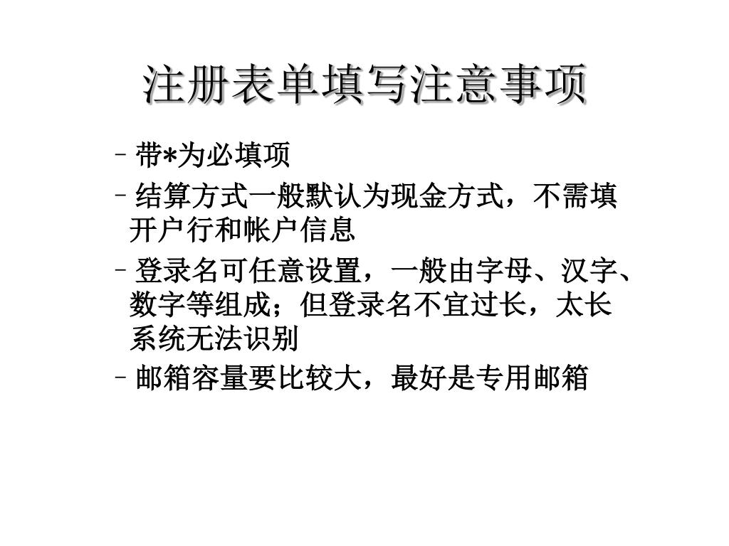 注册表单填写注意事项 带*为必填项 结算方式一般默认为现金方式,不需填开户行和帐户信息 登录名可任意设置,一般由字母、汉字、数字等组成;但登录名不宜过长,太长系统无法识别 邮箱容量要比较大,最好是专用邮箱