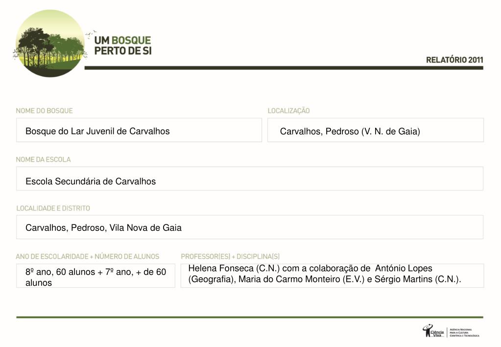 Bosque do Lar Juvenil de Carvalhos Carvalhos, Pedroso (V. N. de Gaia) Escola Secundária de Carvalhos Carvalhos, Pedroso, Vila Nova de Gaia Helena Fonseca (C.N.) com a colaboração de António Lopes (Geografia), Maria do Carmo Monteiro (E.V.) e Sérgio Martins (C.N.). 8º ano, 60 alunos + 7º ano, + de 60 alunos