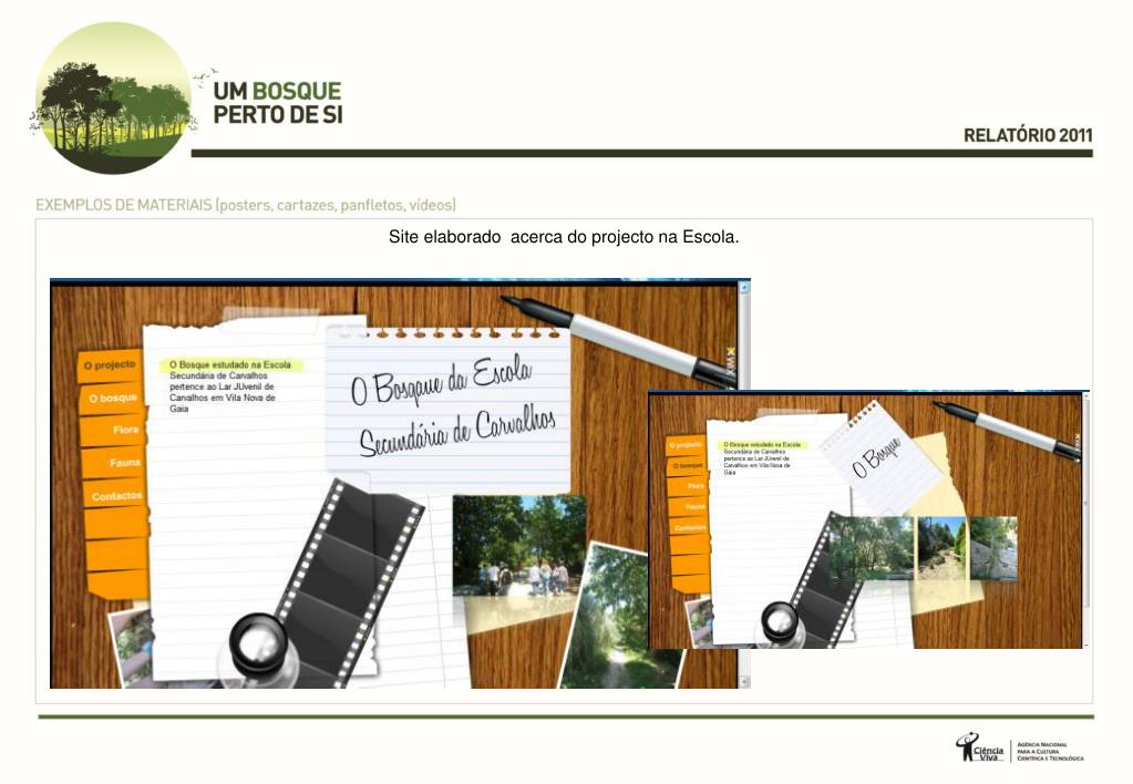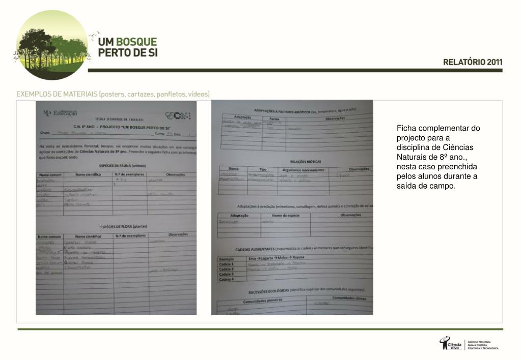Divulgação do projecto: • Nasturmas: atravésdaintegração do mesmonaplanificaçãodadisciplina de C.N. do 8º ano. • Na escola: atravésdaintegração do mesmo no Plano Annual de Actividades • Materaisproduzidos: • Frasessobre a gestão das florestas e do ambienteemsuporte de papel. • Herbário digital • Fichas de trabalho de apoioaodesenvolvimento de conteúdosdadisciplina • Actividadesrealizadas: • Saídas de campo • BI da flora e fauna das florestas. • Ilustraçõescientíficassobre a flora e fauna das florestas. • Exposição “As nossasflorestas” quedecorreu, nabibliotecadaescola, naúltimasemana do 3º Período • Palestra “Floresta: quefuturo?” quedecorreu, no auditóriodaescola, no dia 15 de Junhoemparceria com osBombeirosVoluntários de Carvalhos. • SITE do Herbário Digital e do Projecto: http://www.wix.com/hfescola/o-bosque-da-escarvalhos Ilustração científica Preenchimento da ficha complementar