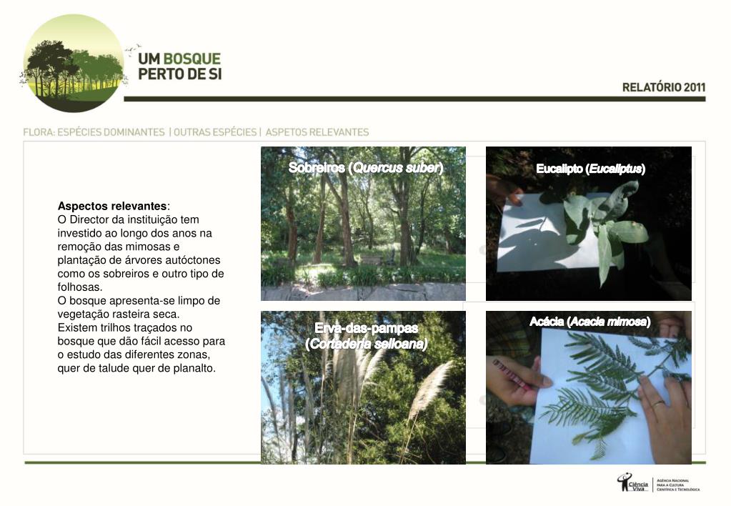 Sobreiros (Quercus suber) Eucalipto (Eucaliptus) Aspectosrelevantes: O Director dainstituição tem investidoaolongo dos anosnaremoção das mimosas e plantação de árvoresautóctonescomoossobreiros e outrotipo de folhosas. O bosqueapresenta-se limpo de vegetaçãorasteiraseca. Existemtrilhostraçados no bosquequedãofácilacessopara o estudo das diferenteszonas, quer de taludequer de planalto. Acácia (Acacia mimosa) Erva-das-pampas (Cortaderiaselloana)