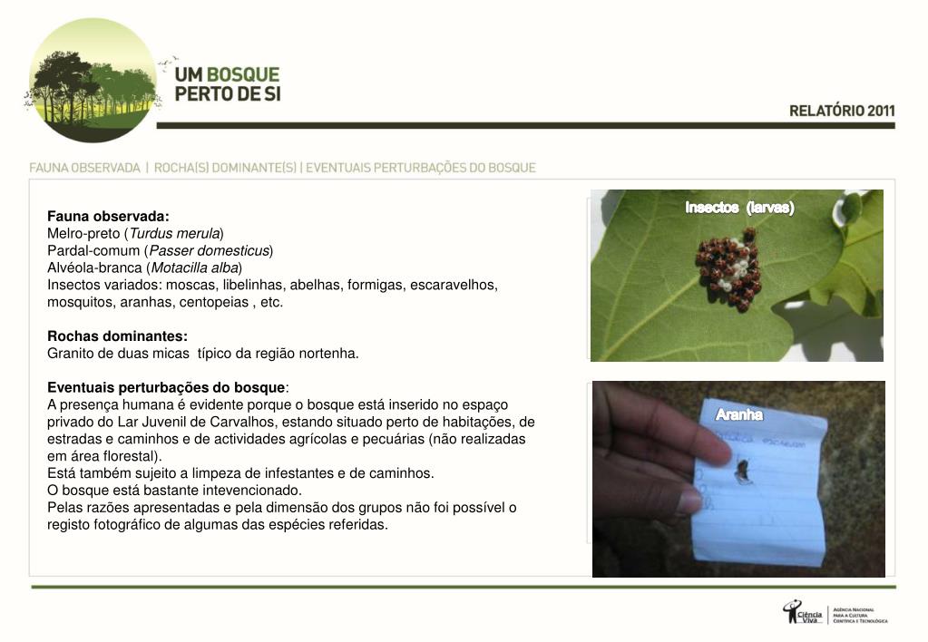 Insectos (larvas) Fauna observada: Melro-preto (Turdusmerula) Pardal-comum (Passer domesticus) Alvéola-branca (Motacilla alba) Insectosvariados: moscas, libelinhas, abelhas, formigas, escaravelhos, mosquitos, aranhas, centopeias , etc. Rochasdominantes: Granito de duas micas típicodaregiãonortenha. Eventuaisperturbações do bosque: A presençahumana é evidenteporque o bosqueestáinserido no espaçoprivado do LarJuvenil de Carvalhos, estandosituadoperto de habitações, de estradas e caminhos e de actividadesagrícolas e pecuárias (nãorealizadasemáreaflorestal). Estátambémsujeito a limpeza de infestantes e de caminhos. O bosqueestábastanteintevencionado. Pelasrazõesapresentadas e peladimensão dos gruposnãofoipossível o registofotográfico de algumas das espéciesreferidas. Aranha
