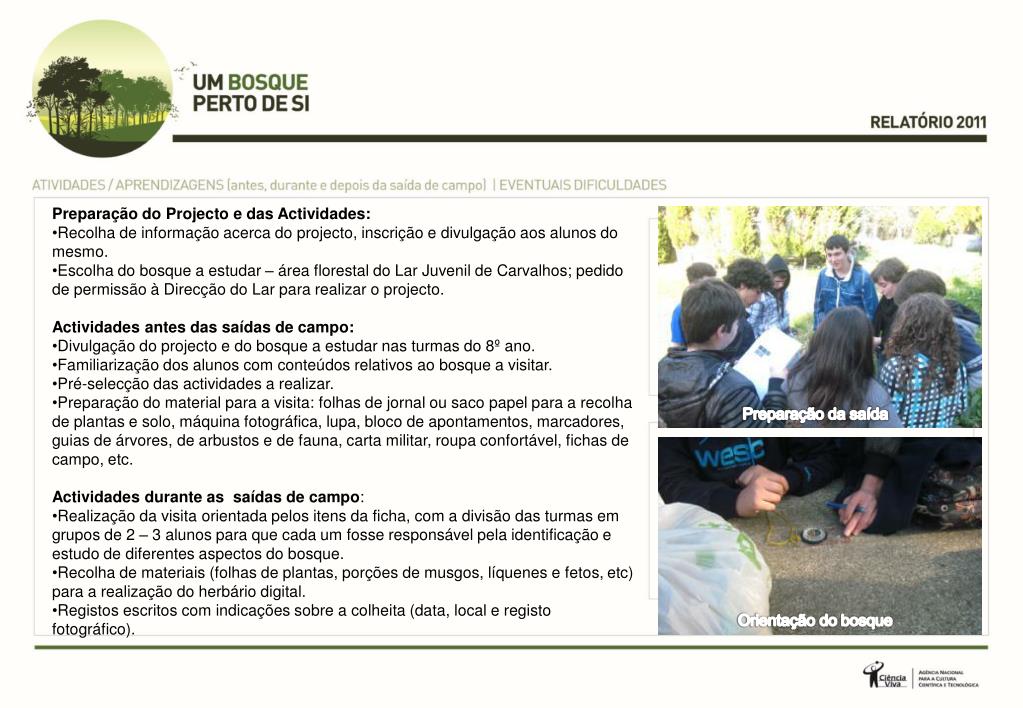 Preparação do Projecto e das Actividades: • Recolha de informação acerca do projecto, inscrição e divulgação aos alunos do mesmo. • Escolha do bosque a estudar – área florestal do Lar Juvenil de Carvalhos; pedido de permissão à Direcção do Lar para realizar o projecto. • Actividades antes das saídas de campo: • Divulgação do projecto e do bosque a estudarnasturmas do 8º ano. • Familiarização dos alunos com conteúdos relativos ao bosque a visitar. • Pré-selecção das actividades a realizar. • Preparação do material para a visita: folhas de jornal ou saco papel para a recolha de plantas e solo, máquina fotográfica, lupa, bloco de apontamentos, marcadores, guias de árvores, de arbustos e de fauna, carta militar, roupa confortável, fichas de campo, etc. • Actividadesdurante as saídas de campo: • Realização da visita orientada pelos itens da ficha, com a divisão das turmas em grupos de 2 – 3 alunos para que cada um fosse responsável pela identificação e estudo de diferentes aspectos do bosque. • Recolha de materiais (folhas de plantas, porções de musgos, líquenes e fetos, etc) para a realização do herbário digital. • Registos escritos com indicações sobre a colheita (data, local e registo fotográfico). Preparação da saída Orientação do bosque