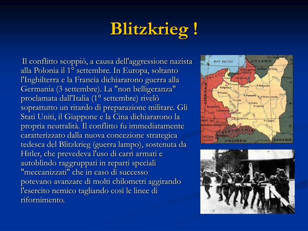 Blitzkrieg ! Il conflitto scoppiò, a causa dell'aggressione nazista alla Polonia il 1° settembre. In Europa, soltanto l'Inghilterra e la Francia dichiararono guerra alla Germania (3 settembre). La "non belligeranza" proclamata dall'Italia (1° settembre) rivelò soprattutto un ritardo di preparazione militare. Gli Stati Uniti, il Giappone e la Cina dichiararono la propria neutralità. Il conflitto fu immediatamente caratterizzato dalla nuova concezione strategica tedesca del Blitzkrieg (guerra lampo), sostenuta da Hitler, che prevedeva l'uso di carri armati e autoblindo raggruppati in reparti speciali "meccanizzati" che in caso di successo potevano avanzare di molti chilometri aggirando l'esercito nemico tagliando così le linee di rifornimento.