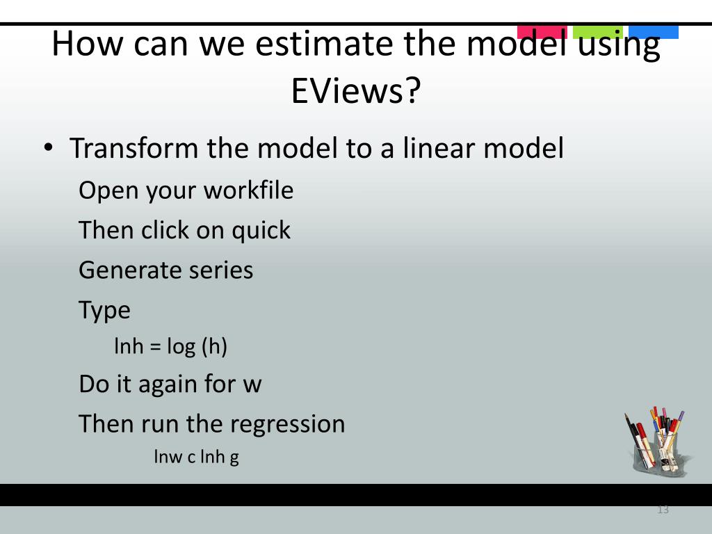How can we estimate the model using EViews? • Transform the model to a linear model Open your workfile Then click on quick Generate series Type lnh = log (h) Do it again for w Then run the regression lnw c lnh g