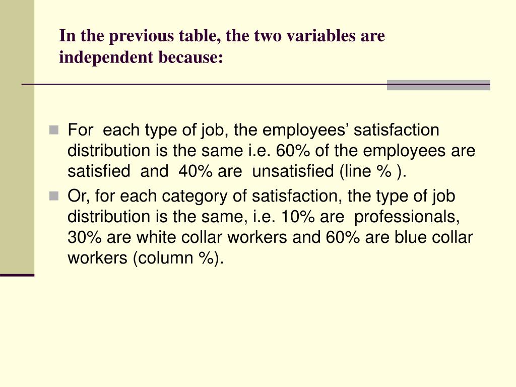 In the previous table, the two variables are independent because: • For each type of job, the employees’ satisfaction distribution is the same i.e. 60% of the employees are satisfied and 40% are unsatisfied (line % ). • Or, for each category of satisfaction, the type of job distribution is the same, i.e. 10% are professionals, 30% are white collar workers and 60% are blue collar workers (column %).