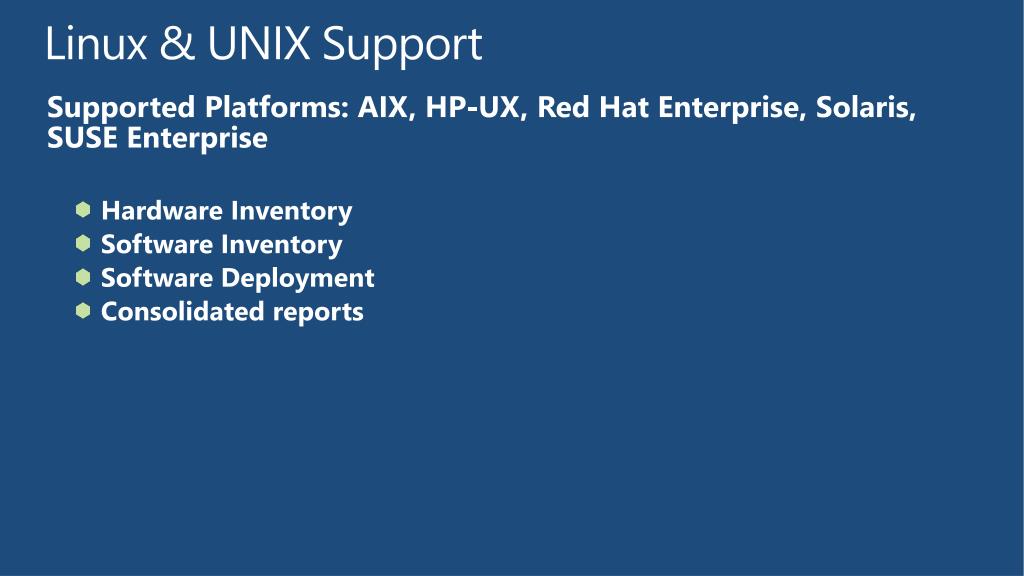 Linux & UNIX Support Supported Platforms: AIX, HP-UX, Red Hat Enterprise, Solaris, SUSE Enterprise • Hardware Inventory • Software Inventory • Software Deployment • Consolidated reports