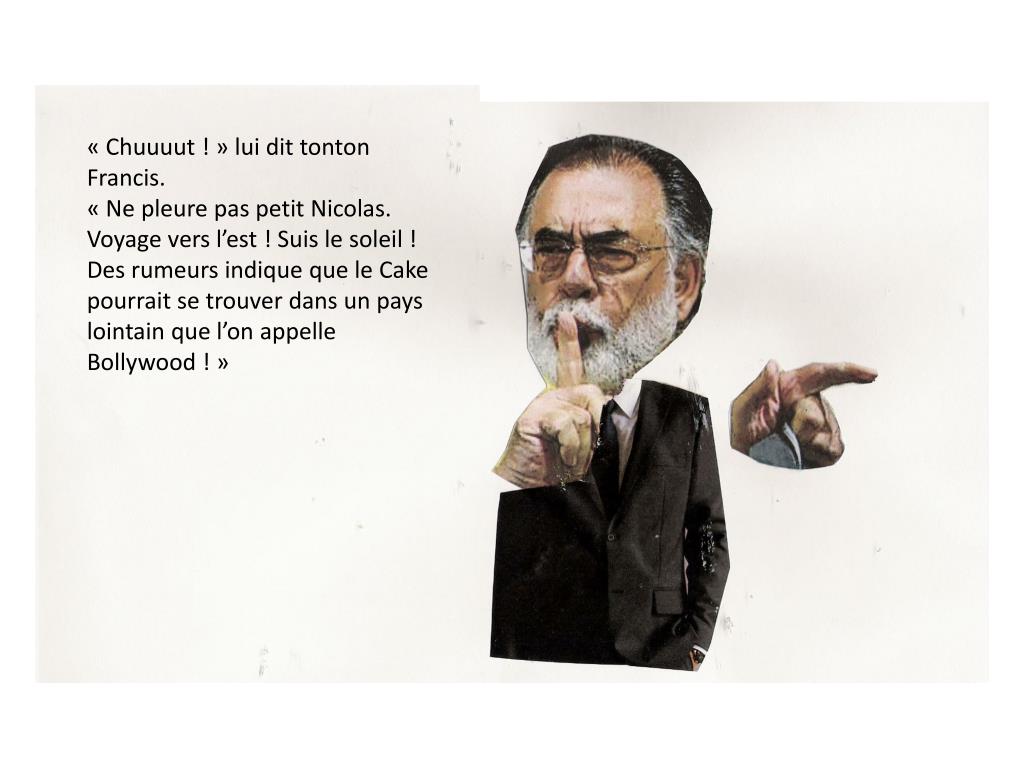 « Chuuuut ! » lui dit tonton Francis. « Ne pleure pas petit Nicolas. Voyage vers l’est ! Suis le soleil ! Des rumeurs indique que le Cake pourrait se trouver dans un pays lointain que l’on appelle Bollywood ! »