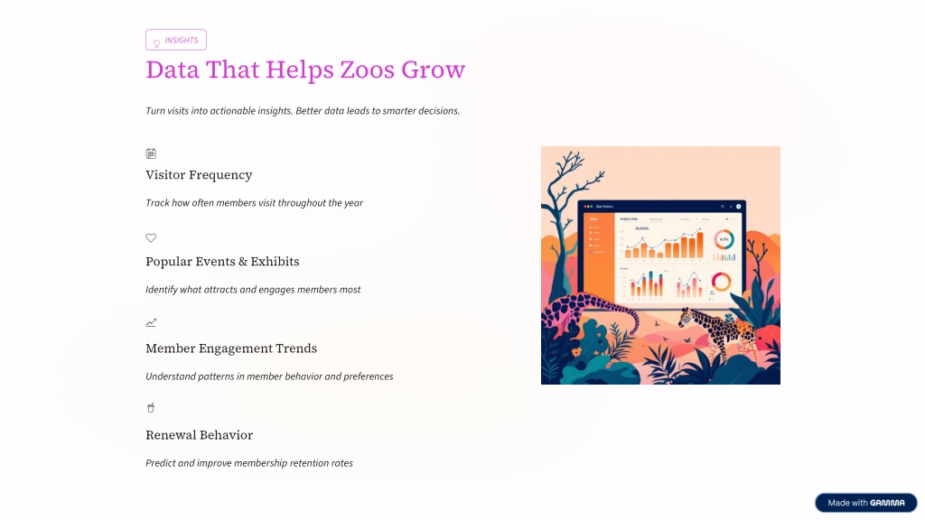 INSIGHTS Data That Helps Zoos Grow Turn visits into actionable insights. Better data leads to smarter decisions. Visitor Frequency Track how often members visit throughout the year Popular Events & Exhibits Identify what attracts and engages members most Member Engagement Trends Understand patterns in member behavior and preferences Renewal Behavior Predict and improve membership retention rates