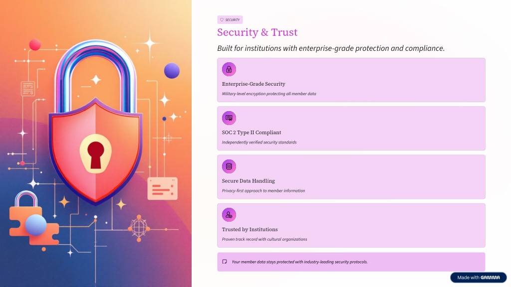 SECURITY Security & Trust Built for institutions with enterprise-grade protection and compliance. Enterprise-Grade Security Military-level encryption protecting all member data SOC 2 Type II Compliant Independently verified security standards Secure Data Handling Privacy-first approach to member information Trusted by Institutions Proven track record with cultural organizations Your member data stays protected with industry-leading security protocols.