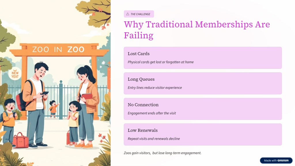 THE CHALLENGE Why Traditional Memberships Are Failing Lost Cards Physical cards get lost or forgotten at home Long Queues Entry lines reduce visitor experience No Connection Engagement ends after the visit Low Renewals Repeat visits and renewals decline Zoos gain visitors, but lose long-term engagement.