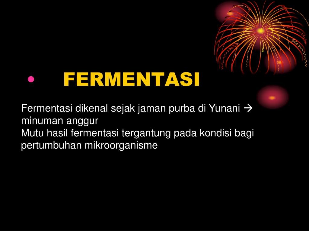 FERMENTASI Fermentasi dikenal sejak jaman purba di Yunani minuman anggurMutu hasil fermentasi tergantung pada kondisi bagi pertumbuhan mikroorganisme