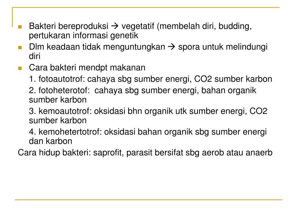 Bakteri bereproduksi vegetatif (membelah diri, budding, pertukaran informasi genetik • Dlm keadaan tidak menguntungkan spora untuk melindungi diri • Cara bakteri mendpt makanan 1. fotoautotrof: cahaya sbg sumber energi, CO2 sumber karbon 2. fotoheterotof: cahaya sbg sumber energi, bahan organik sumber karbon 3. kemoautotrof: oksidasi bhn organik utk sumber energi, CO2 sumber karbon 4. kemohetertotrof: oksidasi bahan organik sbg sumber energi dan karbon Cara hidup bakteri: saprofit, parasit bersifat sbg aerob atau anaerb