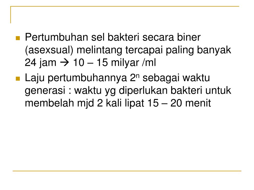 Pertumbuhan sel bakteri secara biner (asexsual) melintang tercapai paling banyak 24 jam 10 – 15 milyar /ml • Laju pertumbuhannya 2n sebagai waktu generasi : waktu yg diperlukan bakteri untuk membelah mjd 2 kali lipat 15 – 20 menit