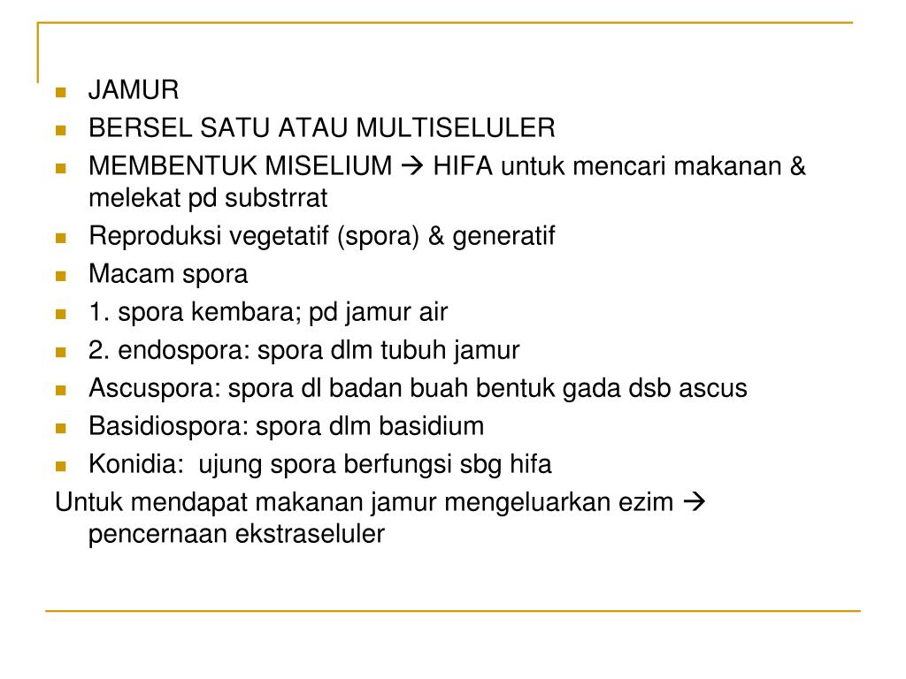 JAMUR • BERSEL SATU ATAU MULTISELULER • MEMBENTUK MISELIUM HIFA untuk mencari makanan & melekat pd substrrat • Reproduksi vegetatif (spora) & generatif • Macam spora • 1. spora kembara; pd jamur air • 2. endospora: spora dlm tubuh jamur • Ascuspora: spora dl badan buah bentuk gada dsb ascus • Basidiospora: spora dlm basidium • Konidia: ujung spora berfungsi sbg hifa Untuk mendapat makanan jamur mengeluarkan ezim pencernaan ekstraseluler