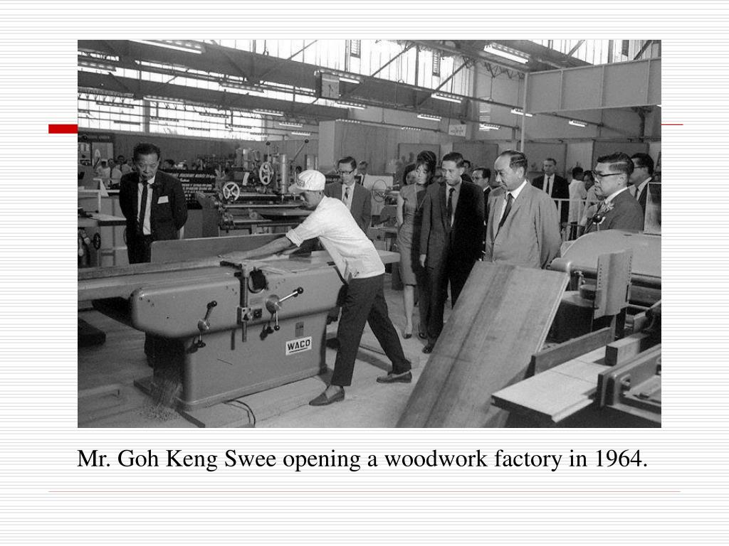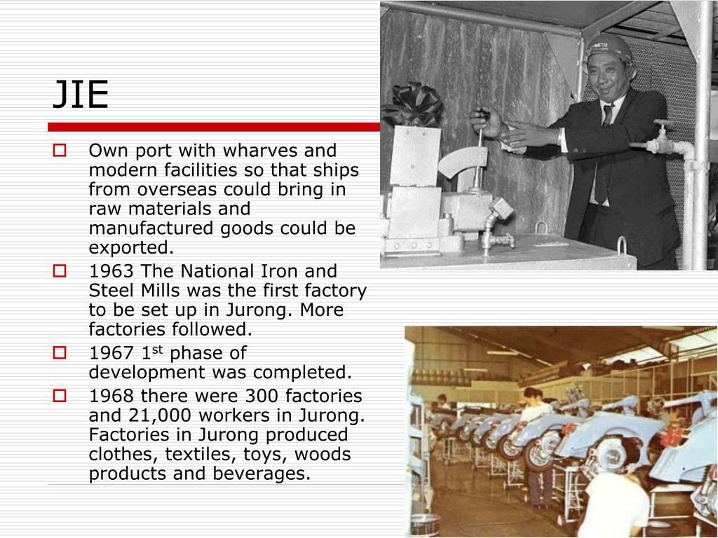 Jurong Industrial Estate (JIE) • July 1960 Minister of Finance, Goh Keng Swee Jurong as an industrial estate. • Located away from any built-up area and close to Malaysia, our hinterland. • Deep water suitable for building a harbour. • Was an area of jungles, swamp and old rubber estates as well as a small fishing village. • Communication lines were laid. • Roads, railway tracks and a network of telephone lines, a power station and a reservoir were constructed.