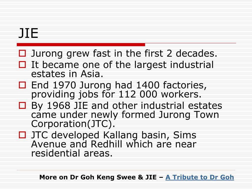JIE • Jurong grew fast in the first 2 decades. • It became one of the largest industrial estates in Asia. • End 1970 Jurong had 1400 factories, providing jobs for 112 000 workers. • By 1968 JIE and other industrial estates came under newly formed Jurong Town Corporation(JTC). • JTC developed Kallang basin, Sims Avenue and Redhill which are near residential areas. More on Dr Goh Keng Swee & JIE – A Tribute to Dr Goh