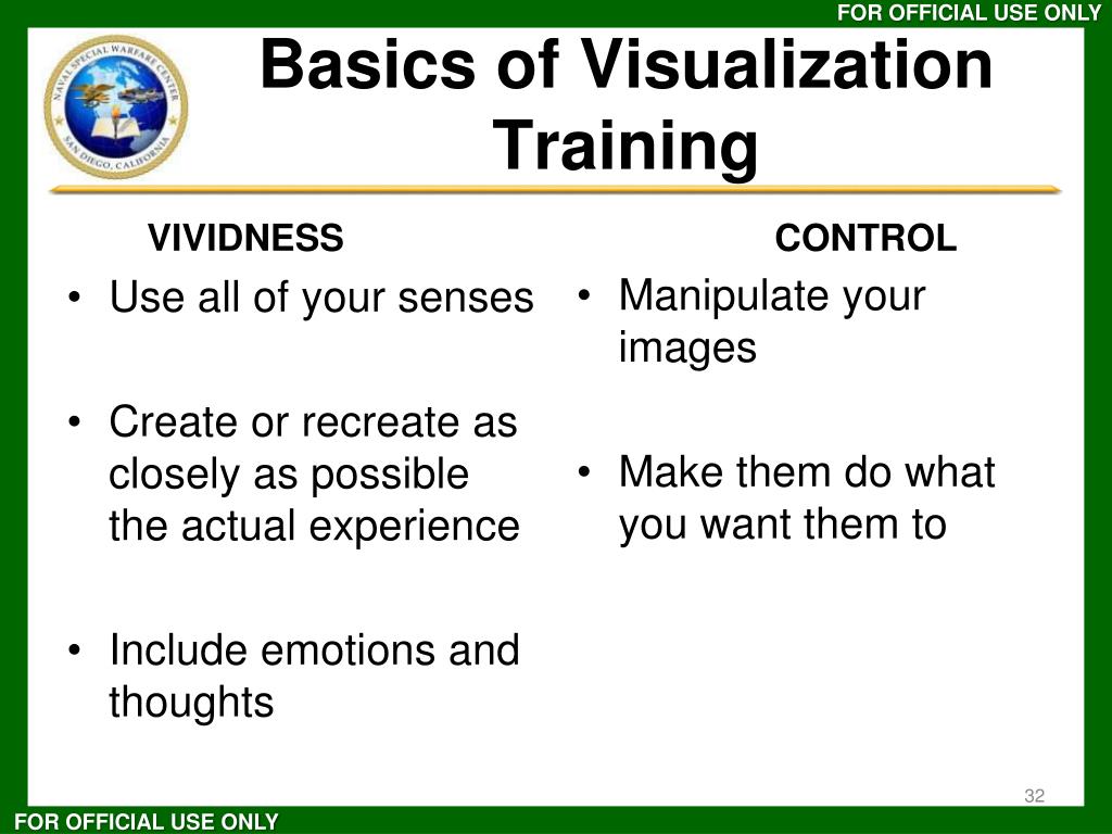 VIVIDNESS CONTROL Basics of Visualization Training • Use all of your senses • Create or recreate as closely as possible the actual experience • Include emotions and thoughts • Manipulate your images • Make them do what you want them to 32