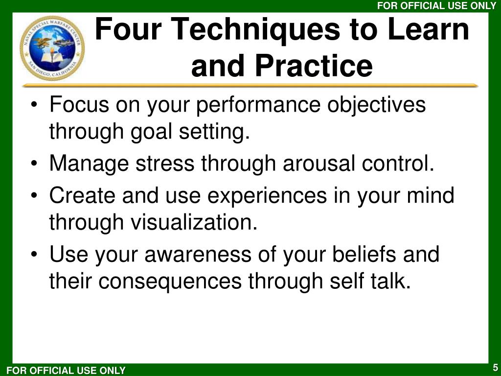 Four Techniques to Learn and Practice • Focus on your performance objectives through goal setting. • Manage stress through arousal control. • Create and use experiences in your mind through visualization. • Use your awareness of your beliefs and their consequences through self talk.