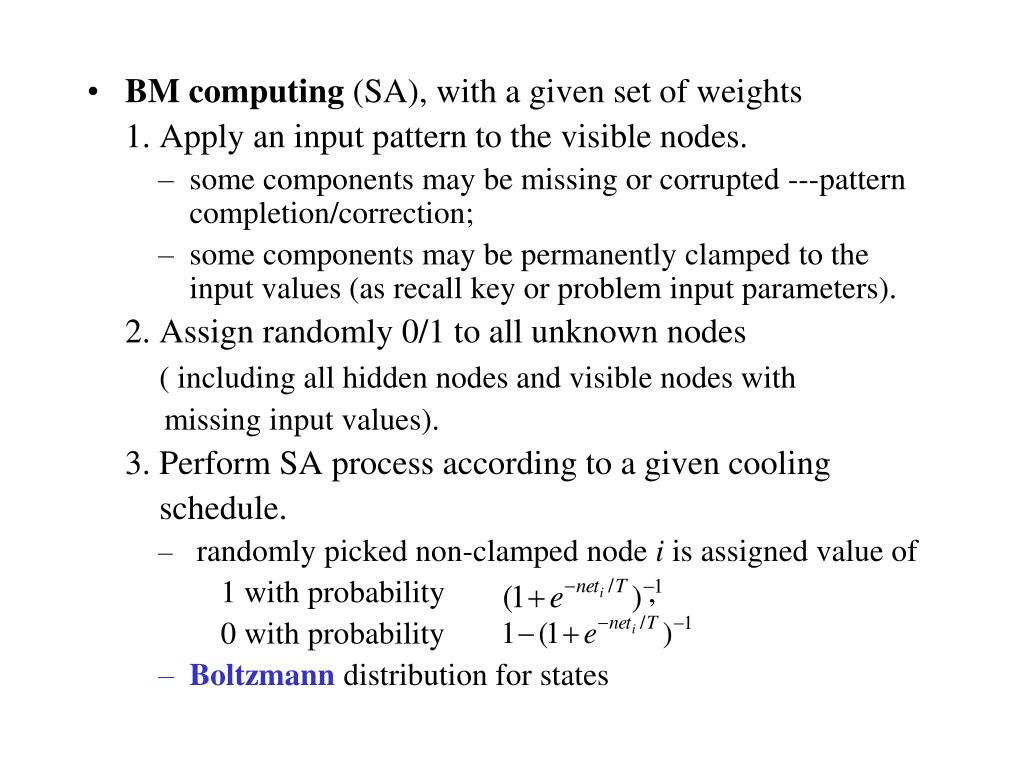 BM computing (SA), with a given set of weights 1. Apply an input pattern to the visible nodes. • some components may be missing or corrupted ---pattern completion/correction; • some components may be permanently clamped to the input values (as recall key or problem input parameters). 2. Assign randomly 0/1 to all unknown nodes ( including all hidden nodes and visible nodes with missing input values). 3. Perform SA process according to a given cooling schedule. • randomly picked non-clamped node i is assigned value of 1 with probability , 0 with probability • Boltzmann distribution for states