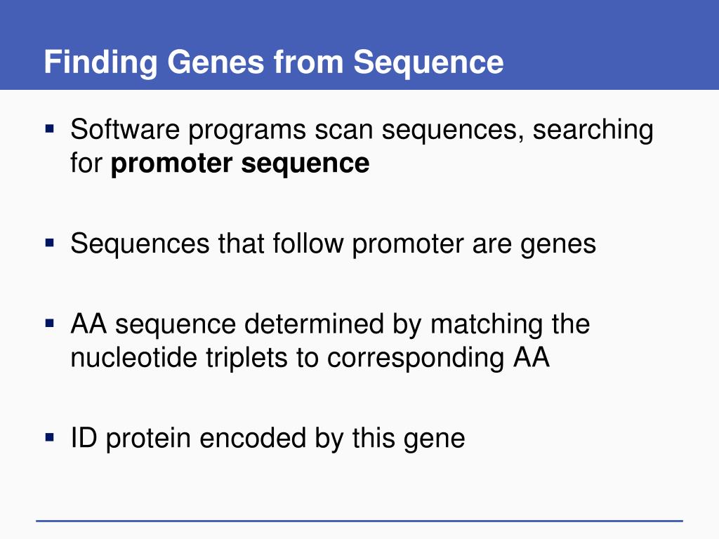 Finding Genes from Sequence • Software programs scan sequences, searching for promoter sequence • Sequences that follow promoter are genes • AA sequence determined by matching the nucleotide triplets to corresponding AA • ID protein encoded by this gene