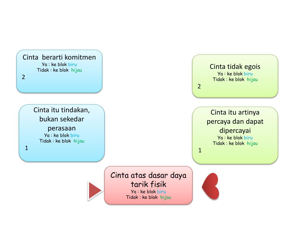 Cintaberartikomitmen Ya : keblokbiru Tidak : keblokhijau 2 Cintatidakegois Ya : keblokbiru Tidak : keblokhijau 2 Cintaitutindakan, bukansekedarperasaan Ya : keblokbiru Tidak : keblokhijau 1 Cintaituartinyapercayadandapatdipercayai Ya : keblokbiru Tidak : keblokhijau 1 Cintaatasdasardayatarikfisik Ya : keblokbiru Tidak : keblokhijau