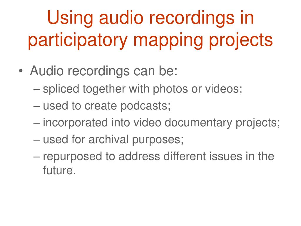 Using audio recordings in participatory mapping projects • Audio recordings can be: • spliced together with photos or videos; • used to create podcasts; • incorporated into video documentary projects; • used for archival purposes; • repurposed to address different issues in the future.