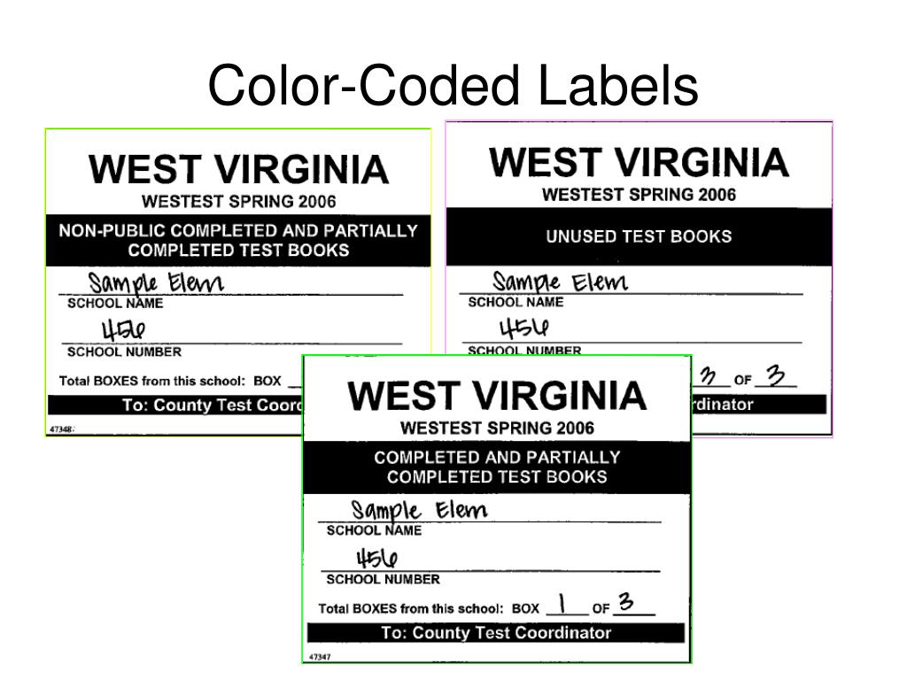 Return of Materials to County Test Coordinator • Fill in all information on the green, yellow and pink labels. • Green – Public Schools --Complete/partially complete test Booklets • Yellow – Non-Public/Home Schools --Complete/partially complete test booklets - Pink – Unused, Braille, and large-print