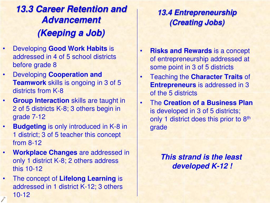 13.3 Career Retention and Advancement (Keeping a Job) 13.4 Entrepreneurship (Creating Jobs) Risks and Rewards is a concept of entrepreneurship addressed at some point in 3 of 5 districts Teaching the Character Traits of Entrepreneurs is addressed in 3 of the 5 districts The Creation of a Business Plan is developed in 3 of 5 districts; only 1 district does this prior to 8th grade This strand is the least developed K-12 ! • Developing Good Work Habits is addressed in 4 of 5 school districts before grade 8 • Developing Cooperation and Teamwork skills is ongoing in 3 of 5 districts from K-8 • Group Interaction skills are taught in 2 of 5 districts K-8; 3 others begin in grade 7-12 • Budgeting is only introduced in K-8 in 1 district; 3 of 5 teacher this concept from 8-12 • Workplace Changes are addressed in only 1 district K-8; 2 others address this 10-12 • The concept of Lifelong Learning is addressed in 1 district K-12; 3 others 10-12