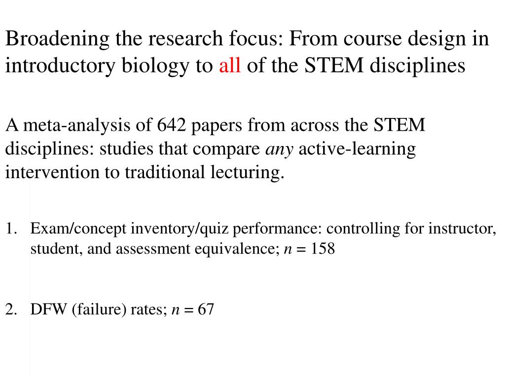 Broadening the research focus: From course design in introductory biology to all of the STEM disciplines A meta-analysis of 642 papers from across the STEM disciplines: studies that compare any active-learning intervention to traditional lecturing. Exam/concept inventory/quiz performance: controlling for instructor, student, and assessment equivalence; n = 158 DFW (failure) rates; n = 67
