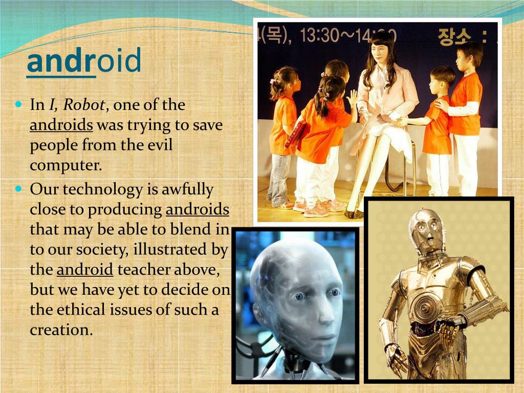 android • In I, Robot, one of the androids was trying to save people from the evil computer. • Our technology is awfully close to producing androids that may be able to blend in to our society, illustrated by the android teacher above, but we have yet to decide on the ethical issues of such a creation.