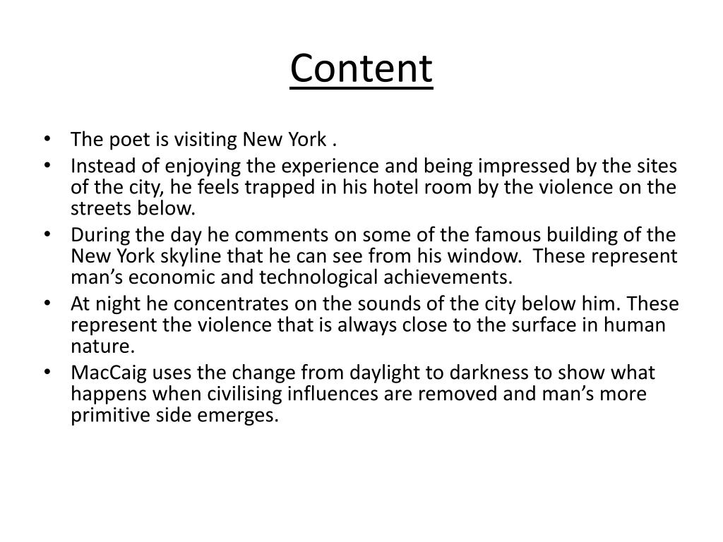 Content • The poet is visiting New York . • Instead of enjoying the experience and being impressed by the sites of the city, he feels trapped in his hotel room by the violence on the streets below. • During the day he comments on some of the famous building of the New York skyline that he can see from his window. These represent man’s economic and technological achievements. • At night he concentrates on the sounds of the city below him. These represent the violence that is always close to the surface in human nature. • MacCaiguses the change from daylight to darkness to show what happens when civilising influences are removed and man’s more primitive side emerges.