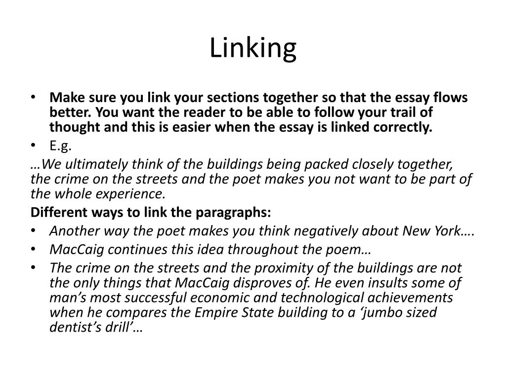 Linking • Make sure you link your sections together so that the essay flows better. You want the reader to be able to follow your trail of thought and this is easier when the essay is linked correctly. • E.g. …We ultimately think of the buildings being packed closely together, the crime on the streets and the poet makes you not want to be part of the whole experience. Different ways to link the paragraphs: • Another way the poet makes you think negatively about New York…. • MacCaig continues this idea throughout the poem… • The crime on the streets and the proximity of the buildings are not the only things that MacCaig disproves of. He even insults some of man’s most successful economic and technological achievements when he compares the Empire State building to a ‘jumbo sized dentist’s drill’…