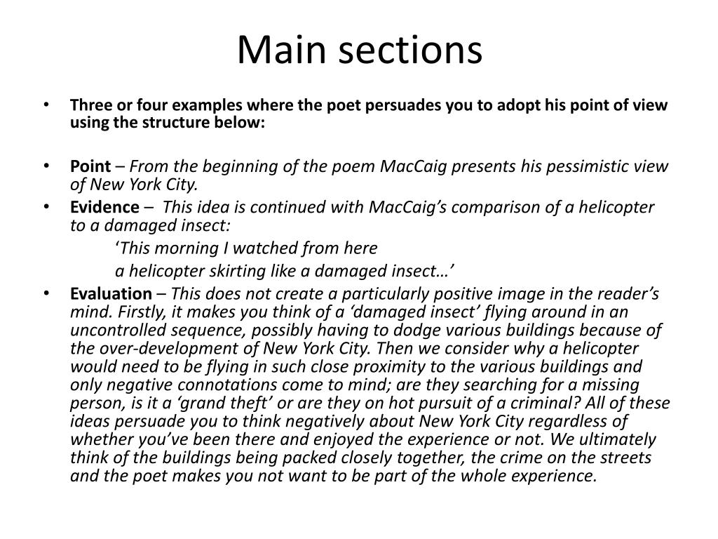 Main sections • Three or four examples where the poet persuades you to adopt his point of view using the structure below: • Point – From the beginning of the poem MacCaig presents his pessimistic view of New York City. • Evidence – This idea is continued with MacCaig’s comparison of a helicopter to a damaged insect: ‘This morning I watched from here a helicopter skirting like a damaged insect…’ • Evaluation – This does not create a particularly positive image in the reader’s mind. Firstly, it makes you think of a ‘damaged insect’ flying around in an uncontrolled sequence, possibly having to dodge various buildings because of the over-development of New York City. Then we consider why a helicopter would need to be flying in such close proximity to the various buildings and only negative connotations come to mind; are they searching for a missing person, is it a ‘grand theft’ or are they on hot pursuit of a criminal? All of these ideas persuade you to think negatively about New York City regardless of whether you’ve been there and enjoyed the experience or not. We ultimately think of the buildings being packed closely together, the crime on the streets and the poet makes you not want to be part of the whole experience.