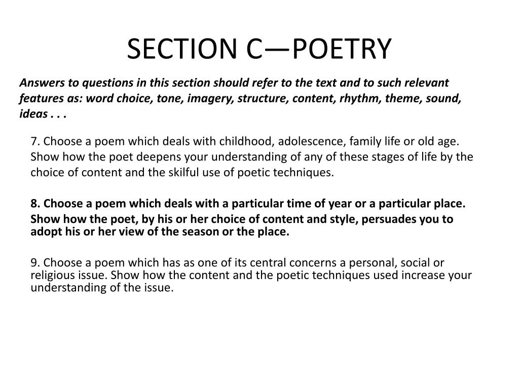 SECTION C—POETRY Answers to questions in this section should refer to the text and to such relevant features as: word choice, tone, imagery, structure, content, rhythm, theme, sound, ideas . . . 7. Choose a poem which deals with childhood, adolescence, family life or old age. Show how the poet deepens your understanding of any of these stages of life by the choice of content and the skilful use of poetic techniques. 8. Choose a poem which deals with a particular time of year or a particular place. Show how the poet, by his or her choice of content and style, persuades you to adopt his or her view of the season or the place. 9. Choose a poem which has as one of its central concerns a personal, social or religious issue. Show how the content and the poetic techniques used increase your understanding of the issue.