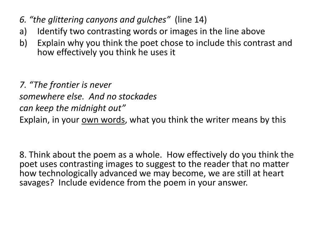 6. “the glittering canyons and gulches” (line 14) • Identify two contrasting words or images in the line above • Explain why you think the poet chose to include this contrast and how effectively you think he uses it 7. “The frontier is never somewhere else. And no stockades can keep the midnight out” Explain, in your own words, what you think the writer means by this 8. Think about the poem as a whole. How effectively do you think the poet uses contrasting images to suggest to the reader that no matter how technologically advanced we may become, we are still at heart savages? Include evidence from the poem in your answer.