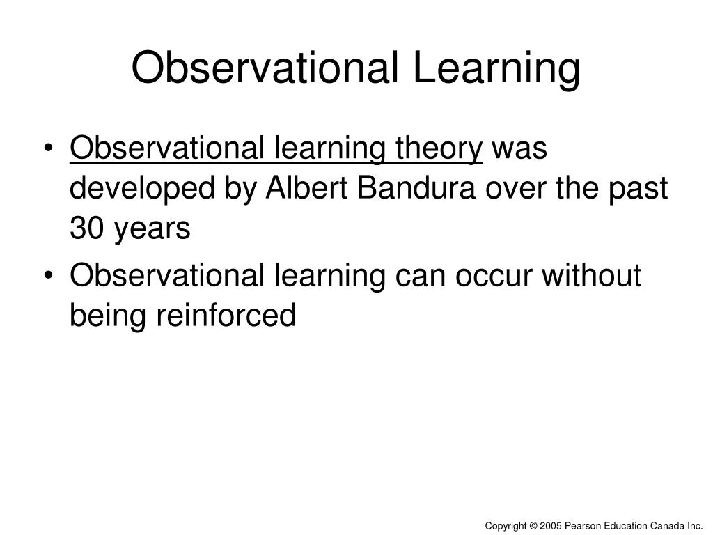 Observational Learning • Observational learning theory was developed by Albert Bandura over the past 30 years • Observational learning can occur without being reinforced