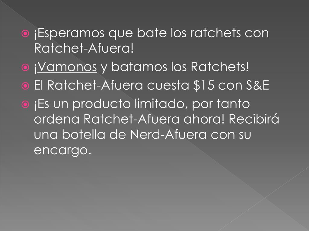 ¡Esperamosque bate los ratchets con Ratchet-Afuera! • ¡Vamonos y batamos los Ratchets! • El Ratchet-Afuera cuesta $15 con S&E • ¡Es un productolimitado, portantoordena Ratchet-Afueraahora! Recibiráunabotella de Nerd-Afuera con suencargo.