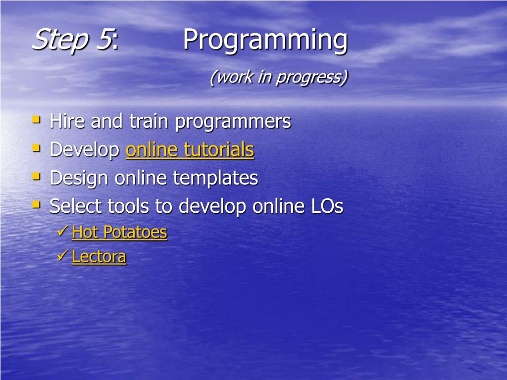 Step 5: Programming(work in progress) • Hire and train programmers • Develop online tutorials • Design online templates • Select tools to develop online LOs • Hot Potatoes • Lectora